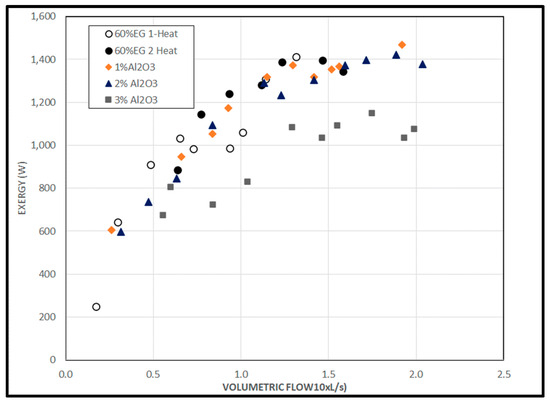 Based on the data of this experiment, the exergy consumed to achieve a given heat rate is qualitatively lower for the nanofluids than for the base fluid 60% EG. Therefore, the nanofluids offer slightly better thermodynamic performance compared to the 60% EG from the viewpoint of the second law of thermodynamics. The results of this experiment show that ensuring that nanofluids are produced under tightly controlled conditions that guarantee long-term stability is critical. Failure to do so can lead to significantly worse performance than their respective base fluids.