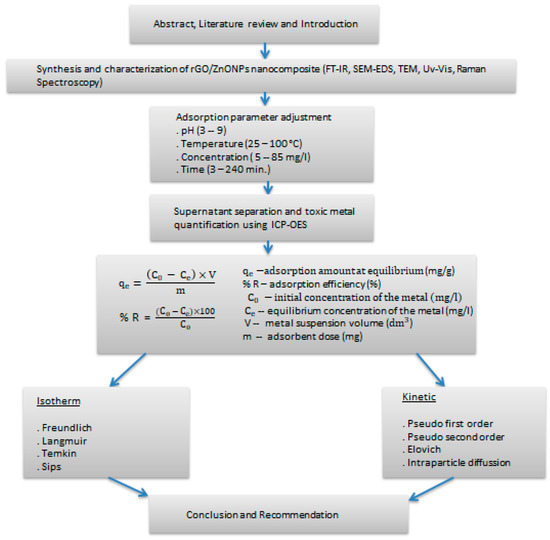 Multiple studied adsorptive materials capable of removing metals from aqueous solutions are clays, biological and agricultural waste, fly ash, chitosans, zeolites, natural oxides, peat moss and activated carbon [23,24,25,26]. However, the reported limitations of these adsorbents are their relatively small metal-binding constants, small selectivity, low removal capacities, instability at low or high pH values, and intolerance for high toxic metal ion concentrations [27,28]. The current manuscript will be setup as presented as presented in Figure 1.