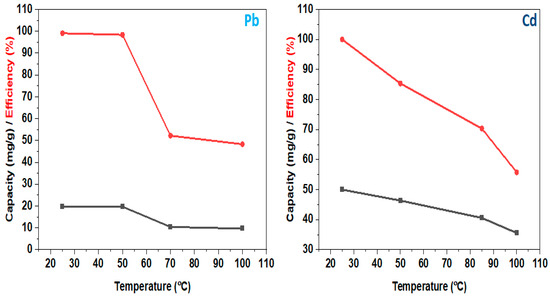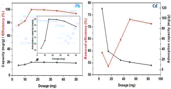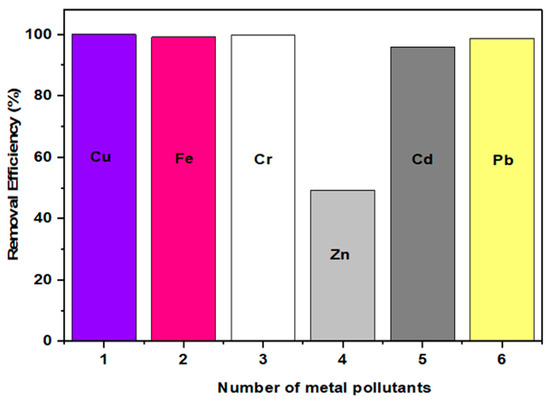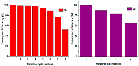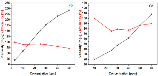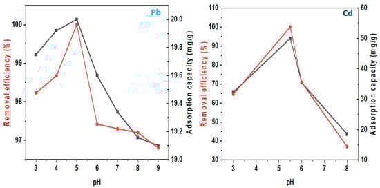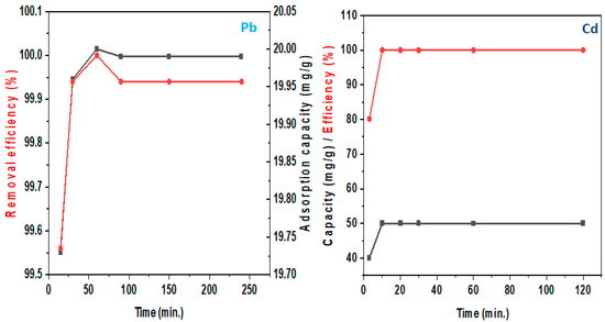 Furthermore, the adsorption method may be monitored by variations in process parameters such as pH, temperature, contact time, and initial concentration [15]. Additionally, the process’s efficiency is also attributed to the adsorbent’s nature—active sites/surface area, kinetics, and selectivity [16]. As a result, several toxic metals including Cd and Pb have been successfully removed via adsorption with high adsorption amounts, capacity, and removal efficiencies [17,18]. Moreover, the regulated maximum contaminant or permissible limits assigned by the World Health Organization for Cr (chromium), Ni (nickel), Pb (lead), Cd (cadmium), As (arsenic), Cu (copper), Hg (mercury), zinc (Zn), and cobalt (Co) in drinkable water are 0.05, 2.0, 0.05, 0.003, 0.01, 2.5, 0.001, 5.0, and 0.1 mg/L, and there is a need for monitoring and treating their amounts in water and wastewater [19].