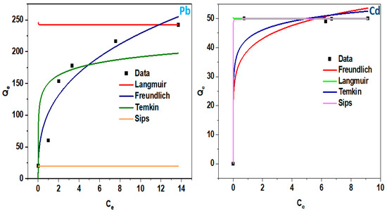 The batch experimental data were fitted by using Langmuir, Freundlich, Tempkin, and Sips models in the determination of sorption capacity via Equations (3)–(6).
