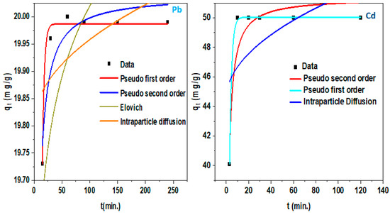 For the investigation of kinetics, 0.015 and 0.050 g of rGO/ZnONPs were added to 100 mL of Pb2+ solution (3 mg/L) and Cd2+ (10 mg/L). The suspensions were stirred at 180 rpm under room temperature. The samples were withdrawn at 3 to 240 min. Afterward, the data were fitted by pseudo-first-order (Equation (7)) and pseudo-second-order equations (Equation (8)), intraparticle diffusion (Equation (9)), and Elovich (Equation (10)).