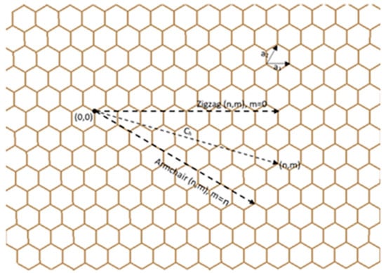 As illustrated in Figure 1, the rolling direction of the graphene sheet directly determines the resulting structural configuration of the carbon nanotube. When the sheet is rolled along the armchair direction, an armchair single-walled carbon nanotube (SWCNT) is formed. Conversely, rolling along the zigzag direction yields a zigzag SWCNT. Any other rolling direction results in a chiral SWCNT, characterized by a chiral vector Ch originating from the lattice point (0,0). This chiral vector can be mathematically expressed in terms of the graphene lattice unit vectors â1 and â2, as shown in Equation (1) [3]: