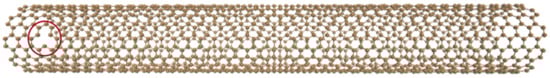 Figure 2a illustrates the armchair configuration, while Figure 2b depicts the zigzag configuration of the SWCNTs subjected to uniaxial tensile loading. Tensile deformation is simulated by fixing both ends of the nanotube and applying an outward displacement until structural failure occurs.