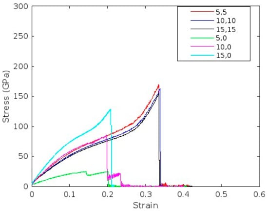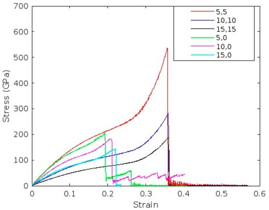 The mechanical properties of armchair and zigzag single-walled carbon nanotubes (SWCNTs) with varying chirality and diameter were investigated using molecular dynamics simulations. Figure 4 and Figure 5 present the stress–strain responses of nanotubes with (5,5), (10,10), and (15,15) armchair configurations and (5,0), (10,0), and (15,0) zigzag configurations. These plots reveal critical insights into the elastic response, yield behavior, and failure mechanisms of CNTs as a function of their structural parameters, offering a comparative understanding of how chirality and diameter influence mechanical performance.