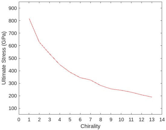 The existing literature offers limited insight into the influence of chirality on the ultimate stress of armchair carbon nanotubes (CNTs), highlighting a gap that this study seeks to address. The mechanical behavior observed in this work demonstrates a consistent trend: ultimate stress decreases with increasing chirality. As shown in Figure 6, this decline in ultimate stress underscores the significant role of chirality in determining the mechanical performance of CNTs.