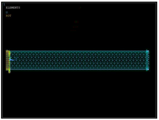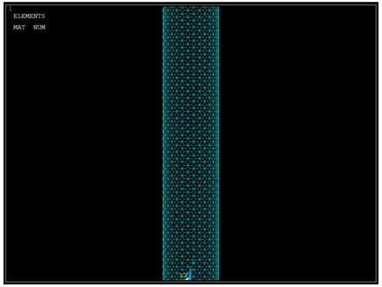 An axial displacement equivalent to 10% of the nanotube length was applied at one end of the CNT along the z-direction, while the opposite end was held fixed to simulate uniaxial tensile loading. With the nanotube length kept constant across all configurations, the resulting stress on the end nodes was calculated to evaluate the mechanical response as a function of chirality. Figure 8, Figure 9, Figure 10 and Figure 11 illustrate various intermediate stages of the finite element method (FEM) analysis performed on the CNT models.