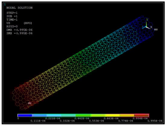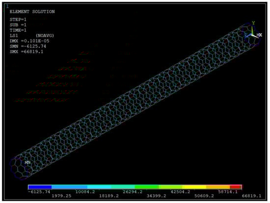 - In the simulation setup, all degrees of freedom at one end of the nanotube were fully constrained, while a displacement corresponding to 10% of the nanotube’s length was applied at the opposite end along the axial (z) direction.