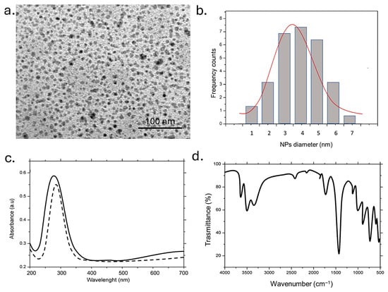 The TEM image showed nearly spherical, well-dispersed NPs with high density. The uniform contrast suggested a homogeneous carbon core; the 100 nm scale bar indicated individual diameters of only a few nanometers. The absence of aggregation highlights good colloidal stability, likely due to hydrophilic surface functional groups on the CDs (Figure 2a). The histogram showed a population centered around ~4 nm with a relatively narrow size spread (ranging from 2 to 6 nm); the red Gaussian fit aligned well with the data, confirming a quasi-monodisperse distribution and a low polydispersity index (Figure 2b). Such small sizes were typical of CDs synthesized via bottom-up approaches and it is suitable for both quantum fluorescence and interactions with polymeric or biological systems. The absorbance spectrum where it was depicted an intense peak at 270–280 nm with a slight extension into the visible region was reported. This peak can be attributed to n-π* transitions of carbonyl groups (–C=O) and π-π* transitions of carbon–carbon double bonds (–C=C). The solid line represents the freshly prepared CDs, while the dashed line showed the UV–Vis spectrum after 96 h. The minimal shift and retention of peak intensity suggested excellent temporal stability, with the CDs maintaining their optical properties over time (Figure 2c).