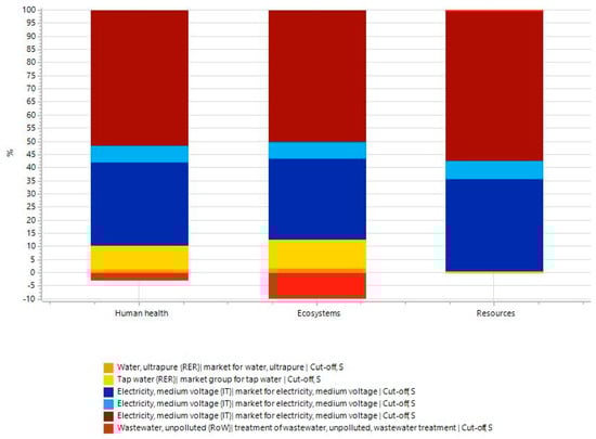 The environmental impacts are presented in Figure 4, aggregated into the three endpoint categories: Human Health, Ecosystem, and Resources. The results show that the largest impact is attributable to energy consumption. For human health, it accounts for about 90% of the total impact, with tap and ultrapure water contributing an additional 10%. In the ecosystem area, electricity remains the main source of impact, though wastewater treatment provides a small environmental credit. Resource depletion is almost entirely driven by electricity, with negligible input from ultrapure water.