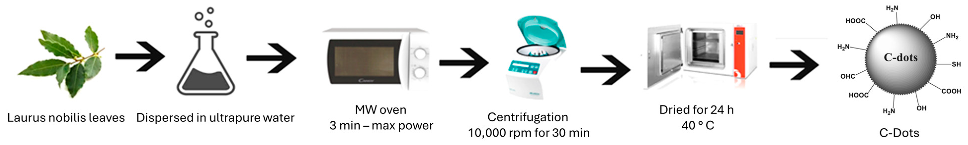 The synthesis of CDs was carried out as follows: Laurus nobilis leaves provided by the company Radice Cubica s.rl, Lecce, Italy, were thoroughly washed to remove dust and pollutants. They were then air-dried at room temperature, chopped, and 3 g were weighed and placed into a glass flask with 20 mL of ultrapure water. The glass flask was then placed in a microwave oven for approximately 3 min at maximum power. Afterward, the solution was transferred into centrifuge tubes and centrifuged at 10,000 rpm for 30 min. The dark brown pellet containing the synthesized nanoparticles was collected and washed with deionized water.