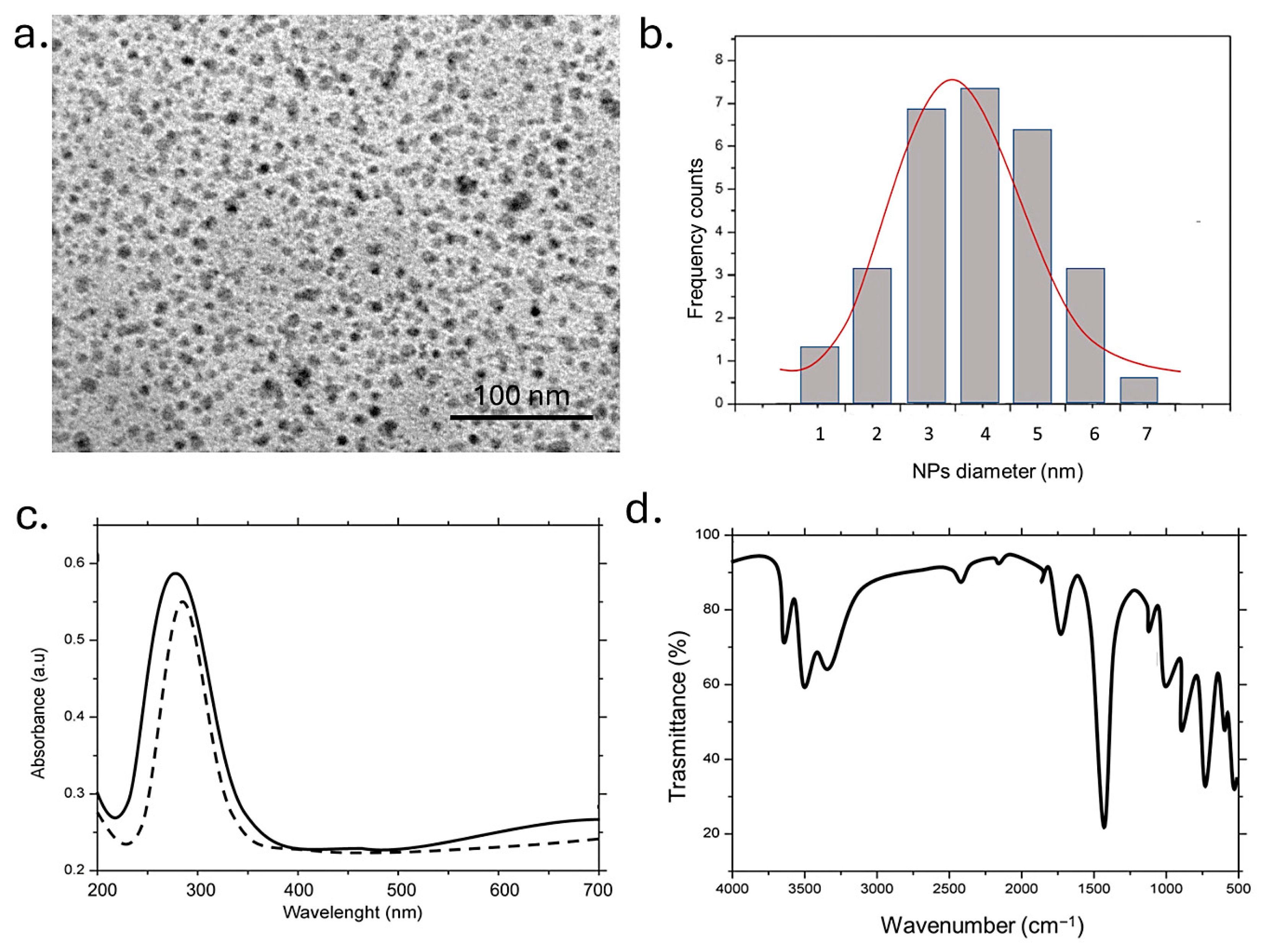 Figure 2b). Such small sizes were typical of CDs synthesized via bottom-up approaches and it is suitable for both quantum fluorescence and interactions with polymeric or biological systems. The absorbance spectrum where it was depicted an intense peak at 270–280 nm with a slight extension into the visible region was reported. This peak can be attributed to n-π* transitions of carbonyl groups (–C=O) and π-π* transitions of carbon–carbon double bonds (–C=C). The solid line represents the freshly prepared CDs, while the dashed line showed the UV–Vis spectrum after 96 h. The minimal shift and retention of peak intensity suggested excellent temporal stability, with the CDs maintaining their optical properties over time (