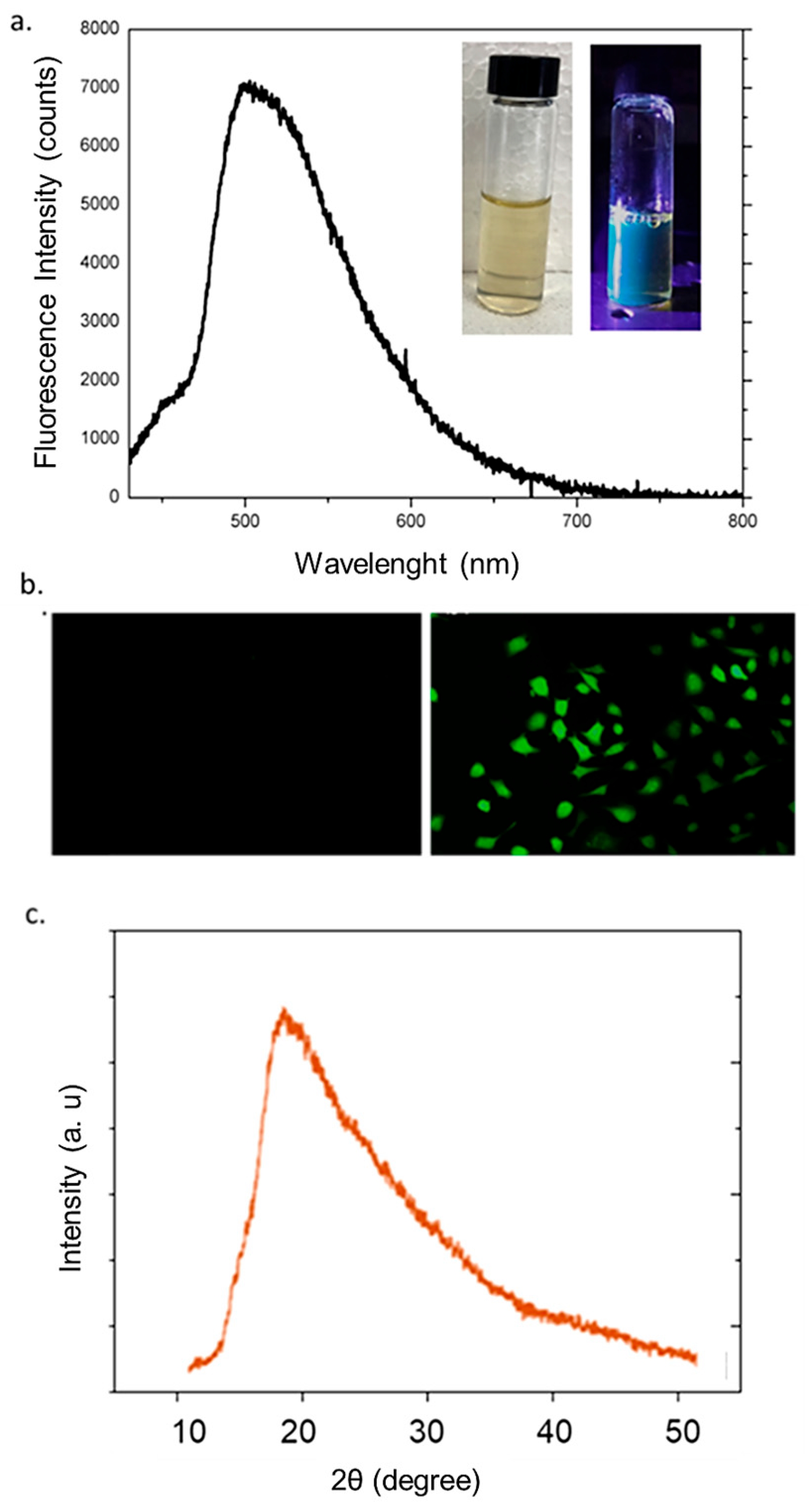 Figure 3b, the labeled cells exhibited a markedly higher fluorescence compared to the control group, clearly indicating their promising applicability in nanomedicine. Complementary structural analysis was conducted via X-Ray Diffraction (XRD) (