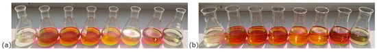 The color of the solutions prepared at 20 °C (a) and at 75 °C (b) (from left to right pH 3, 4, 5.5, 6, 8, 10, 12, 13).