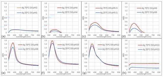 UV-vis spectra of AgNPs synthesized at different pH values on the day of synthesis (D0), measured at 25 °C (blue) and 75 °C (red). Panels: (a) pH 3, (b) pH 4, (c) pH 5.5, (d) pH 6, (e) pH 8, (f) pH 10, (g) pH 12, (h) pH 13.