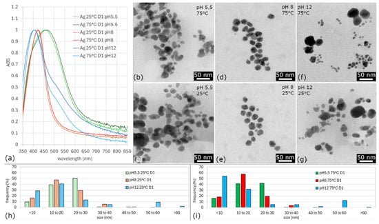 Approximated UV-vis spectra of AgNPs synthesized at pH 5.5, 8, and 12 at 25 °C and 75 °C on D1 (a). TEM microphotographs of AgNPs at pH 5.5 (b,c), pH 8 (d,e), and pH 12 (f,g) for 75 °C and 25 °C, respectively. Size distribution histograms for nanoparticles synthesized at temperatures of 25 °C (h) and 75 °C (i).