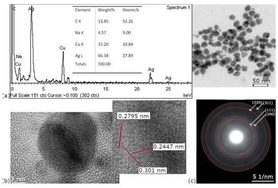 The EDS characterization confirmed the presence of silver in all analyzed samples. Figure 4a presents a representative spectrum of nanoparticles synthesized at pH 8 and 75 °C. A strong silver signal is presented, but other elements such as Cu and Na are also obvious. The Cu signal is caused by the copper grid, which was used in sample preparation, and Na is a residue from the pH treatment. The presence of Cu as an artifact was well-documented and described by Jianqiang Hu et al. [], who reported that copper grids can produce spurious Cu signals due to electron scattering.