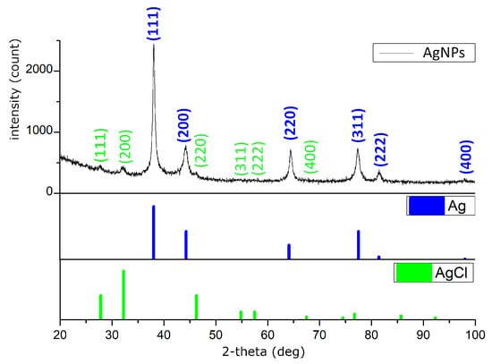 The presence of AgCl detected in our XRD patterns can be explained by the occurrence of chloride ions (Cl−) in the plant extracts used for the synthesis. Chlorides are naturally present in many plants as mineral salts (for example, NaCl, KCl) [,] or may originate from the growth medium and water [] used during extract preparation. During the reduction of Ag+ to Ag0, Cl− ions can react with silver ions to form insoluble AgCl, which may precipitate alongside AgNPs. This phenomenon has been reported in several studies on green synthesis of silver nanoparticles using plant extracts, where AgCl was identified as a secondary phase in XRD patterns due to the presence of chlorides in the biological medium [,,]. The formation of AgCl in such systems is therefore considered a common and well-documented outcome rather than contamination.