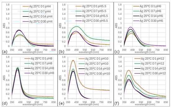 UV-vis spectra showing the evolution of SPR bands of AgNP colloids synthesized at 25 °C over time (D1, D7, D14, D30) at different pH values: (a) pH 4, (b) pH 5.5, (c) pH 6, (d) pH 8, (e) pH 10, and (f) pH 12.