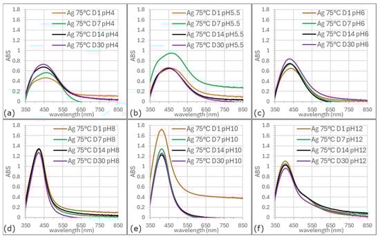 UV-vis spectra showing the evolution of SPR bands of AgNP colloids synthesized at 75 °C over time (D1, D7, D14, D30) at different pH values: (a) pH 4, (b) pH 5.5, (c) pH 6, (d) pH 8, (e) pH 10, and (f) pH 12.