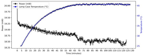 Variation in power output and case temperature of light source. After a 30 min warmup period, the drift in power between 30 and 120 min was 2.6%.