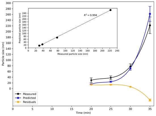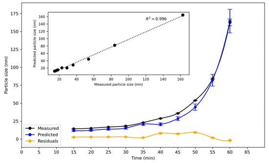 Evolution of z-average particle size during synthesis of silica nanoparticles as measured by DLS, predicted particle size, and residual for third run of reaction B in 160 L reactor. Predictions were made by the model built from data for the 6 L reactor. Data are plotted as a function of time since the start of the reaction. The residual was about 2 to 3 nm from 15 to 35 min, rising to a maximum value of 9 nm at 50 min. Inset: measured and predicted particle size at discrete times.