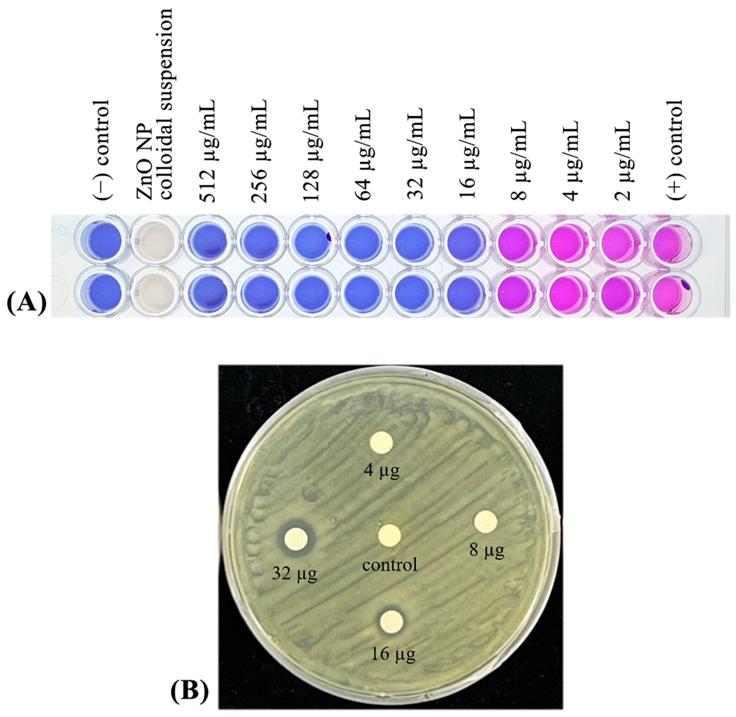 | ZnO NP Concentration (µg/disc) | Zone of Inhibition (mm) |