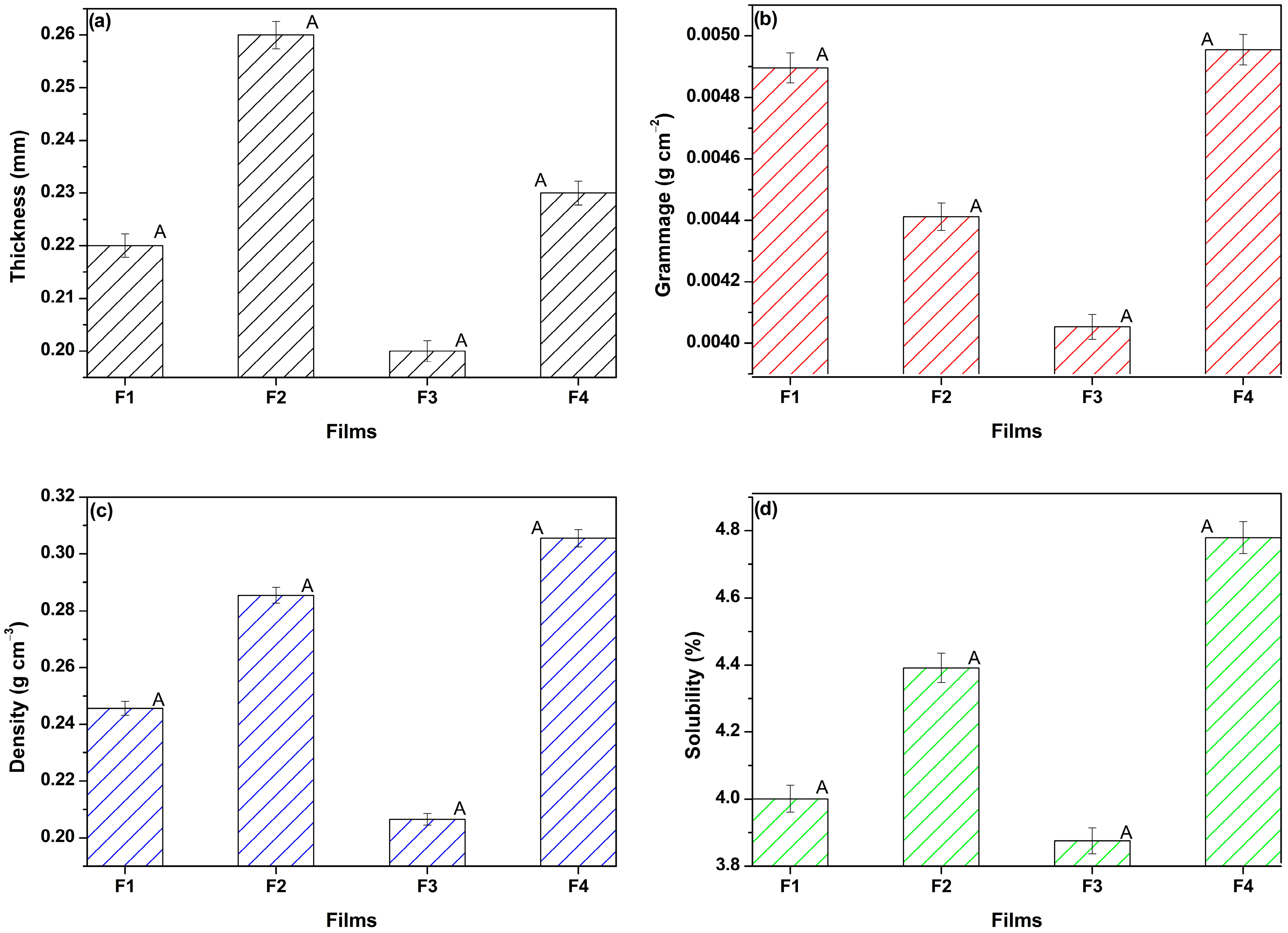 | Films 1 | Tensile Strength (MPa) | Young’s Modulus (MPa) | Elongation at Break (%) |