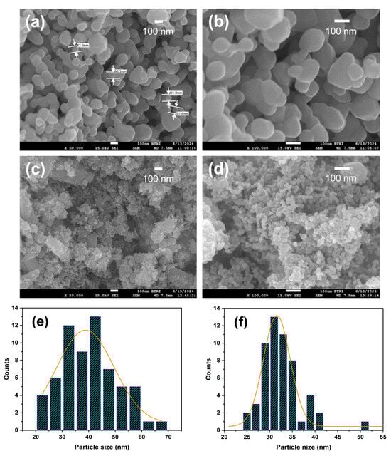 FESEM images of (a,b) ZnO and (c,d) 3% Al–ZnO nanoparticles, and size distribution histogram of (e) ZnO and (f) 3% Al–ZnO nanoparticles.