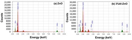 The EDS analysis, performed at 15 kV, is shown in Figure 4 and represents the elemental composition of the nanoparticles. In both ZnO and 3% Al–ZnO, Zn has the characteristic X-ray energy peaks at around 1keV for the L line and 8.6–9.7 keV for the characteristic K line, whereas the distinct peak for O Ka is associated with 0.5 keV [32]. In Figure 4b, the additional characteristic peak of Al Ka at around 1.5 keV verifies the successful doping of Al in ZnO. The peaks related to carbon in 3% Al–ZnO represent its presence as a surface contaminant [33].