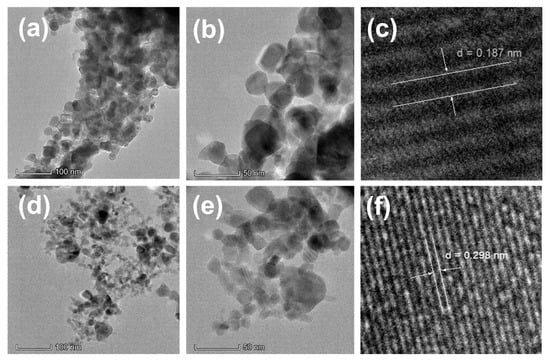 The TEM images of ZnO and 3% Al–ZnO are depicted in Figure 5. In both samples, the particles are mainly spherical in shape, with some exhibiting varying and hexagonal morphologies. The particles of Al–ZnO (Figure 5a,b) have slightly higher aggregation and smaller sizes compared to pure ZnO (Figure 5d,e), which is consistent with the FESEM results. The interatomic distances for both materials were calculated using ImageJ from high-resolution TEM at 20 nm magnification. The lattice spacing for ZnO was found to be 0.187 nm, which is close to the (102) plane, and 0.298 nm, with a 6% expansion, for 3% Al–ZnO on the (100) plane, according to JCPDS-36-1451 for ZnO. The expansion of the interatomic distance suggests some interstitial doping of aluminum in the crystal lattice of ZnO [34].