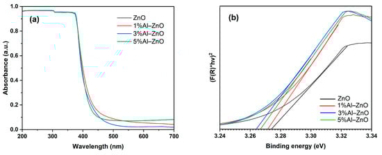 Optical characterization of the photocatalysts was performed via UV-vis diffuse reflectance spectroscopy (UV-DRS). The materials exhibited the highest absorbance in the UV region (200–400 nm) with reduced absorption in the visible region, as shown in Figure 6a. The band gap energy of both ZnO and Al-doped ZnO was calculated using the Tauc relationship (Equation (3)), as demonstrated in Figure 6b.