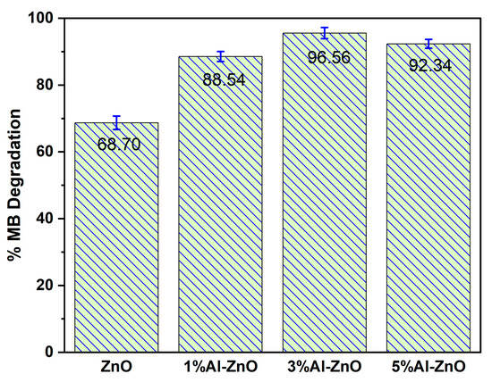 The performance of the materials for photocatalytic degradation of methylene blue (MB) dye was examined under 60 min of exposure to sunlight with a catalyst dose of 0.5 g/L and an initial dye concentration of 25 mg/L. Results are illustrated in Figure 8, where the MB degradation efficiencies are 68.70%, 88.54%, 96.56% and 92.34% for ZnO, 1% Al–ZnO, 3% Al–ZnO, and 5% Al–ZnO, respectively. Al-doped ZnO exhibited higher performance than pure ZnO due to improved morphological and optical properties. The maximum efficiency (3% Al–ZnO) is achieved due to its lowest band gap of 3.24 eV, which results in maximum light absorption, as confirmed by UV-DRS. TEM and XPS results indicate that Al doping promotes the formation of intrinsic point defects, such as zinc and oxygen vacancies, which are crucial for photocatalysis. These point defect levels can trap electrons and holes, making them the focal points of redox reactions and delaying the electron–hole recombination process [42]. According to a previous report, ZnO is positively charged below pH 7–8, and MB is also a cationic dye with a pKa value of ~3.8. Although adsorption by electrostatic attraction may play a significant role in photocatalysis, different non-ionic interactions, such as hydrogen bonding between the OH group of chemisorbed water on 3% Al–ZnO and the electronegative N atom of MB, are also notable here [19,43]. However, the presence of reactive oxygen species (•OH, •O2−, etc.) is the primary driver for the photocatalysis. The lower performance of 5% Al–ZnO compared to 3% Al–ZnO is attributed to surface deterioration caused by excessive concentrations of doped Al, faster recombination of electron–hole pairs, and insufficient hydroxyl production [44].