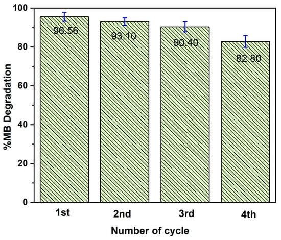 The reusability of photocatalysts is a critical parameter for ensuring the effective removal of contaminants. This is because a higher recycling potential fosters long-term, repetitive applications, making the pollutant removal technology using nanomaterials more affordable and sustainable. The reusability of the 3% Al–ZnO nanoparticles evaluated for the photocatalytic degradation of MB over four consecutive cycles under identical experimental conditions is illustrated in Figure 11, showing that in the first cycle, the photocatalyst achieved a degradation efficiency of 96.56%, with degradation rates of 93.10% for the second cycle, 90.40% for the third, and 82.80% for the fourth cycle. The slight reduction in degradation efficiency with increasing cycle number is attributed to the formation of toxic degradation products on the catalyst’s active sites, which prevent light from reaching the catalyst surface. Nonetheless, according to the results of this experiment, the photocatalyst demonstrates high reusability, maintaining an efficiency of over 82% after four cycles, making it feasible for industrial applications and environmental remediation to eliminate organic pollutants from the aqueous environment.
