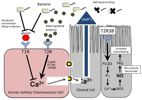 In addition to expressing bitter taste receptors, SCCs also express sweet taste receptors, the T1Rs [,,]. These receptors are sensitive to sweet compounds, such as glucose, in concentrations far lower than those detected orally []. Typically, airway surface liquid (ASL) glucose levels are maintained at a homeostatic level of approximately 0.5 mM; there is a physiologic leak and continuous reuptake of glucose from the adjacent basolateral serum that maintains this concentration []. At this physiologic level of glucose, T1R2 and T1R3 receptors are tonically activated. The activation of sweet taste receptors on SCCs appears to antagonize the action of bitter taste receptor cascades through activation of cAMP and phosphodiesterase which subsequently block activation of the IP3 receptor []. During bacterial infection, there is a reduction in ASL glucose due to increased bacterial consumption. It is hypothesized that it is this reduction in glucose that causes a reduction in sweet taste receptor activation, resulting in a corresponding increase in bitter taste receptor activity and responsivity to microbial bitter products []. Thus, the balance tips in favor of T2R responses and mobilization of innate immune defenses, theoretically restoring the balance towards airway microbial homeostasis and normalized glucose concentrations.