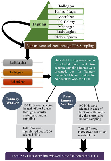 A three-stage sampling design was used in this study. At the primary stage, seven localities in the Jajmau area, namely Tadbagiya, Kailash Nagar, J.K. colony, Asharfabad, Motinagar, Chabeelepurwa, and Budhiyaghat, were selected based on a higher concentration of leather tannery workers’ households in these areas as informed by several stakeholders in the city. In the second stage, three out of the seven localities, namely Budhiyaghat, Tadbagiya, and Asharfabad, were chosen using the probability proportional to size (PPS) sampling technique after positioning them in growing order of assessed number of HHs of leather tannery workers. Afterward, an inclusive household listing and mapping was finished in each of the three localities. Moreover, all the listed households were classified into three groups: households having at least one tannery worker, irrespective of having any non-tannery worker, households with non-tannery worker(s), and households having no workers.