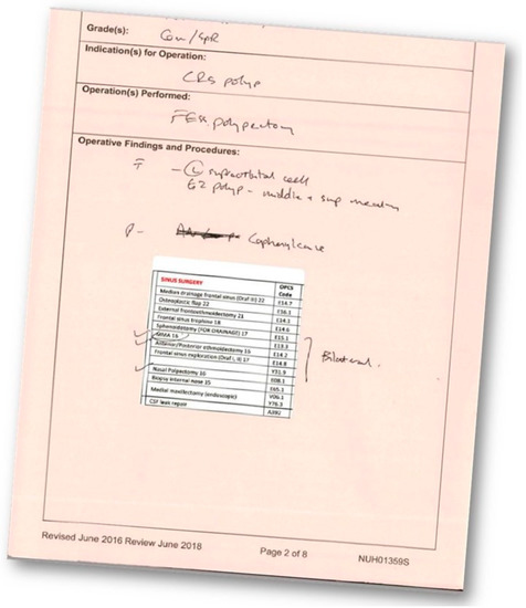 Mettias, B.; Whittaker, J.D.; Ramakrishnan, Y. Real-Time Operative Coding for Endoscopic Sinonasal Procedures: Quality Improvement in Practice. Sinusitis 2021, 5, 32-44. https://doi.org/10.3390/sinusitis5010004