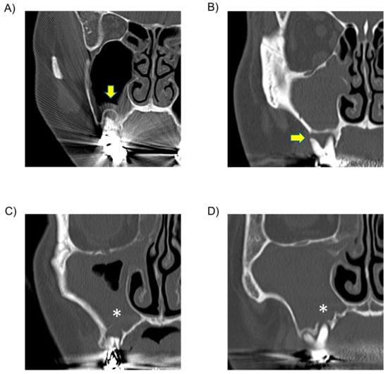It is important to identify the causative teeth and evaluate the extent of inflammation and sinusoidal shadowing to determine a treatment strategy for OMS. Traditionally, simple radiographic examinations such as the Waters method and dental panoramic imaging have been used. However, these tomographic scans are two-dimensional, and the presence of artifacts makes diagnosis difficult []. As a result, there is difficulty in evaluating bone resorption in the alveolar bone of the maxillary sinus and in confirming the extent of root lesions and the presence of oroantral fistulae. In recent years, however, CT imaging has become widespread enough to generate images in multiple directions using sagittal and coronal sections in addition to horizontal sections. As a result, CT imaging is said to be the most useful in the diagnosis of root apex lesions and alveolar bone resorption in the maxillary sinus [,]. Cone-Beam CT is becoming more common in the field of otolaryngology due to its high spatial resolution, low radiation dose, and reduced effect of metal artifacts, which makes it possible to evaluate apex lesions in detail [,].