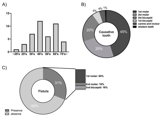 (A) Age distribution. Average age is 50.0 ± 15.0 years old, male to female ratio is about 1:1; (B) Causative tooth details; (C) Presence and location of oroantral fistulae of all root apex lesions.