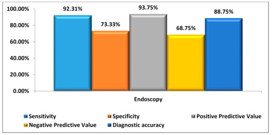 Sensitivity, specificity, positive predictive value, and negative predictive value of endoscopy, taking CT as the gold standard.