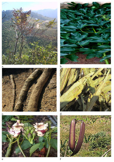 Oroxylum indicum: (a): whole tree; (b): leaves; (c): stem; (d): stem bark; (e): flowers; (f): fruits.