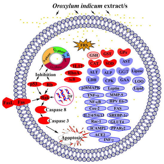 ACE2: angiotensin-converting enzyme II; ALP: alkaline phosphatase; ALT: alanine aminotransaminase; AST: aspartate transaminase; COX: cyclooxygenase; CPK: creatinine phosphokinase; DF: DNA fragmentation; FasL: Fas ligand; FAS: fatty acid synthetase; FRS: free radical scavenging; GAA: α-glucosidase; GLUT4: glucose transporter; GPx: glutathione peroxidase; GSH: glutathione; GST: glutathione-s-transferase; HPV: human papilloma virus; IL: interleukin; IκB: nuclear factor of kappa light polypeptide gene enhancer in B-cells inhibitor; INF-γ: interferon-γ; LDH: lactate dehydrogenase; LOO: lipid peroxidation; MAPK: microtubule associated protein kinase; MMP: matrix metalloproteinase; NF-κB: nuclear factor kappa B; Rac: Ras-related C3 botulinum toxin substrate; Rb: retinoblastoma protein; Rho: Ras homolog family member; SOD: superoxide dismutase; TNF: tumor necrosis factor; sterol regulatory element-binding proteins 1c (SREBP-1c); PPARγ2: proliferator-activated receptor-γ 2.