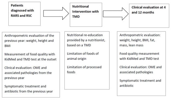 Patients with anatomical abnormalities, allergies, or who had been treated surgically were excluded from the study. The study consisted of comparing the incidence of RARS and CRS in the previous and subsequent years after applying the TMD. The intervention focused on food re-education based on the TMD through the use of the nutritional education program “Learning to eat from the Mediterranean”, which was used in previous studies [12,13]. This program consists of a series of visits with the nutritionist and the pediatrician, who propose to assist the family. Visits are monthly for the first 4 months and bimonthly until the year is completed. The first visit evaluates the diet made by each child and his/her family, and changes in the usual diet are proposed by making schemes, culinary recipes, example menus, etc. Most of the families were accustomed to the traditional (Mediterranean) diet, although its implementation was highly contaminated by industrial pressure. Thus, it was necessary to help them differentiate one from the other. A baseline anthropometric assessment is also performed. Patients were monitored over the course of a year, valuing weight, stature, growth, clinical evolution, treatment needs, adherence to the TMD, and the degree of satisfaction of the families. An explanatory diagram is shown in Figure 1. The study was approved by the Research Committee of the University General Hospital of Ciudad Real (Internal code: C-95, Act 03/2017).