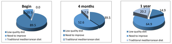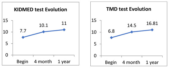 To evaluate the dietary habits of patients and their families, we used the Mediterranean Diet Quality Index (KIDMED) test [34,35] and the TMD test that we presented in previous works with the intention of covering the proposed changes by the TMD [33]. The KIDMED test is one of the most prestigious for evaluating the quality of children’s nutritional intake based on the TMD. It consists of a questionnaire of 16 questions that must be answered affirmatively/negatively (yes/no). Affirmative answers to the questions that represent a negative connotation in relation to the Mediterranean diet (there are four) are worth −1 point, and affirmative answers to the questions that represent a positive aspect in relation to the Mediterranean diet (there are 12) are worth +1 point. Negative answers do not score. Therefore, this index can range from 0 (minimum adherence) to 12 (maximum adherence). In order to measure the newly proposed points, we developed a complementary test (the traditional Mediterranean diet test or the TMD test) with the same structure, to which we have added nutritional and behavioral questions that—in our opinion—are not reflected in the KIDMED test. This test consists of 20 questions that must be answered affirmatively/negatively. Unlike the KIDMED test, in the TMD test, all the questions are positive. They are therefore scored with one point for each affirmative answer, and the results can range between 0 and 20 points. A test score below or equal to 7 points is considered ‘poor quality’, a score between 8 and 14 points is considered as ‘need to improve’, and scores above 15 points are considered as ‘optimal traditional Mediterranean diet’. At each visit, we evaluate the nutritional tests, and together with the patients and their parents we analyze any difficulties that may have arisen and examine how we could modify the behavior to obtain the best results. Both questionnaires allow the KIDMED index and the TMD index to be calculated. According to scores obtained in the KIDMED questionnaire, three degrees of the quality of the Mediterranean diet can be obtained: (a) ‘good’ or ‘optimal’, when the score is equal to or greater than eight; (b) ‘average’ or ‘need to improve diet or nutritional habits’, when the score is between four and seven, inclusive; and (c) ‘poorly adapted’ or ‘low-quality diet’, when the score is equal to or less than three. According to the scores obtained in the TMD index, three grades are obtained: low quality ≤7, moderate quality 8–14, optimal quality >14. Physical activity and other variables of the Mediterranean lifestyle were not considered, programmed, or monitored, but rather were included only as general recommendations.