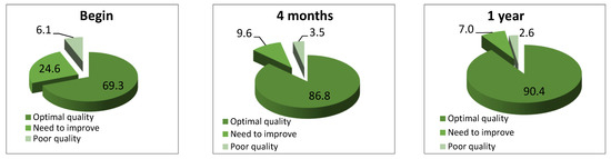 The mean value of the KIDMED index at the beginning of the program was 7.7 ± 1.82 points; 24.6% of the patients obtained a qualification according to the KIDMED test of “need to improve” and 69.3% obtained the qualification of “optimal diet”. At the end of the study, 90.4% of the children obtained optimal levels with a mean of 11 points, mean difference of 2.11 ± 0.10 (95% CI: 1.91–2.31 p < 0.01). According to this data, the average value of the KIDMED index evolved from a score considered medium-high at the beginning of the program to an optimal value at the end of the program (Table 7, Figure 3 and Figure 4).
