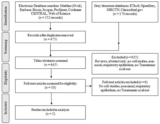 Multiple databases were searched by the first author, including Medline (Ovid) (1946–present), Embase (1947–2020), Scopus, Biosis (1945–2020), ProQuest, and Web of Science, in March 2020 and again in November 2020. Grey literature was sought on OpenGrey and E-thesis Online Service (EThOS). The bibliography list of all the included studies were hand-searched against the inclusion and exclusion criteria. The following search terms were used: “Tranexamic acid” OR “Anti fibrinolytic” OR “AMCA” OR “t-AMCA” OR “Cyklokapron” AND “Nasal epithelium” OR “Respiratory epithelium” OR “nasal mucosa”. OR “Respiratory mucosa”.
