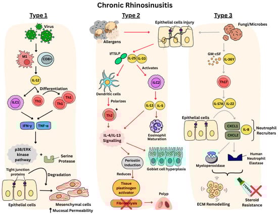 In T1 CRS, viral or intracellular pathogens activate TLR3 and TLR9 on epithelial cells, inducing IL-1β, IL-12p70, and IL-18 [4]. These cytokines activate dendritic cells to drive Th1 polarization through the JAK2–TYK2–STAT4 signaling pathway [5], leading to T-bet transcription factor expression that controls IFN-γ production [6]. Group 1 innate lymphoid cells (ILC1s) subsequently provide rapid IFN-γ secretion alongside activated Th1 and CD8+ T cells [7,8]. IFN-γ serves as the central distinct cytokine for T1 endotype CRS, engaging epithelial IFN-γ receptors to activate STAT1 signaling and promote epithelial barrier disruption through degradation of tight junction proteins (occludin, ZO-1) and epithelial-to-mesenchymal transition via multiple pathways including TGF-β, Wnt, and p38/ERK [9,10,11]. Hallmark biomarkers of T1 CRS are the CXCR3 chemokine ligands, CXCL9 (MIG), CXCL10 (IP-10), and CXCL11 (I-TAC), which demonstrate diagnostic performance for endotype identification [12]. In nasal lavage fluid, CXCL9 achieves an area under the curve (AUC) of 0.869 (85% sensitivity, 75% specificity), while CXCL10 achieves an AUC of 0.815 (93% sensitivity, 63% specificity) for T1 endotype detection [12]. These IFN-γ-induced chemokines create gradients that recruit CXCR3-expressing CD8+ T cells, NK cells, and additional Th1 cells. The resulting neutrophil-dominant inflammation; characterized by elevated tissue IFN-γ levels, CD8+ T cell infiltration, and M1 macrophage predominance [13], underlies the non-polypoid CRS phenotype and is associated with steroid resistance and poor treatment outcomes [14].