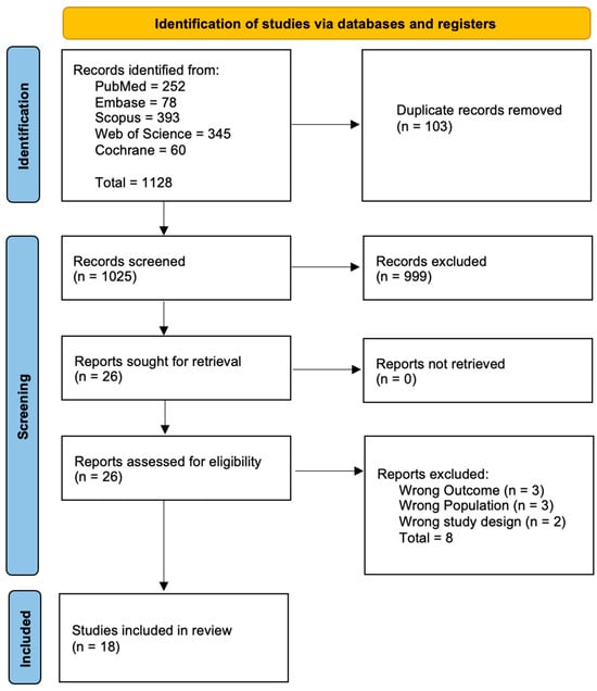 A comprehensive literature search was done on 15 July 2025 to ascertain current research done on CRS endotyping and the gaps in knowledge. The search was conducted on PubMed, Cochrane, Web of Science, Embase, and Scopus from January 2000 to July 2025 using the following keywords: “Chronic Rhinosinusitis”, “Endotypes”, “CRS endotyping”, “Asian populations”, “Precision Medicine”, “personalized treatment”, “Biomarkers”, “Therapeutic targets” and “Research gaps”. Table 1 summarizes the search strategy as well as the inclusion and exclusion criteria used in this review. A total of 1128 studies were obtained from the 5 databases. After removing duplicates and including only the relevant articles, a total of 18 studies were included in our review as shown in Figure 2. The search and screening of relevant articles for discussion were conducted by main authors SLBJ and NCYM. These were later vetted by authors FDP and NCL.