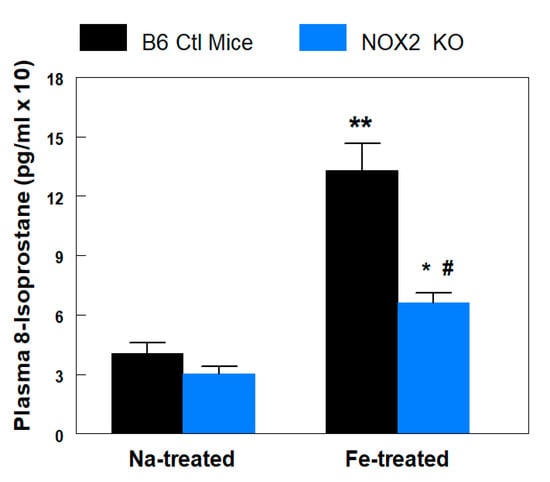 B6 wildtype control and NADPH oxidase 2 (NOX2) knockout (KO) mice exposed to chronic Fe-overload were compared with respect to in vivo lipid peroxidation (8-isoprostane). Plasma samples were obtained after sacrifice of B6 (8 weeks) or KO (8 weeks) mice, which received biweekly i.p. injections of Fe (2.5 mg/g/week)- or Na-dextran. Plasma 8-isoprostane levels were determined by an enzyme immunoassay kit from Cayman Chemical. Values are means ± SE of 4–5 mice. * p < 0.05 and ** p < 0.01 vs. Na-dextran treated KO and B6, respectively; # p < 0.01 vs. Fe-treated B6.