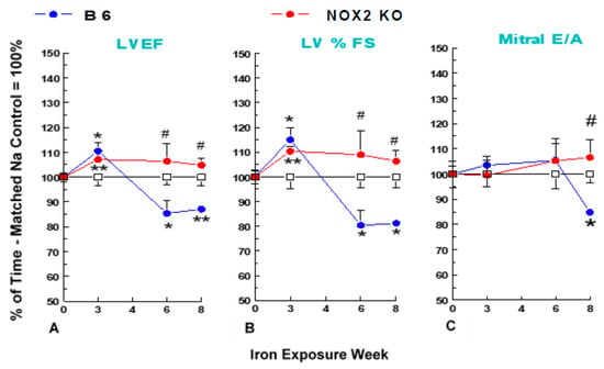 Iron-overload (2.5 mg/g/week Fe-dextran, i.p.) - induced cardiac dysfunction in NOX2 KO and B6 mouse strains. B6 and NOX2 KO mice received injections of Fe- or Na-dextran (Ctl) each week for up to 8 weeks, and echocardiography was performed at the described times. Percentage of time-matched Na-control values are means ± SE of 5 mice. Absent SEMs (standard error of the means) are within symbol size. No significant differences in any baseline parameter were noted between strains. (A) LVEF = left ventricular ejection fraction, (B) % FS = percentage fractional shortening; and (C) mitral valve E/A = mitral valve early(E)/late (atrial = A) ventricular filling velocity ratio. ** p < 0.02 and * p < 0.05 versus time-paired Na-control; # p < 0.05 versus time-paired Fe-treated B6.