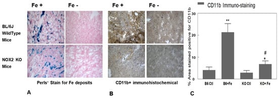 NADPH oxidase 2 (NOX2) knockout (KO) and B6 wildtype control mice exposed to chronic Fe-overload were compared with respect to in vivo cardiac tissue iron deposition (A) and cardiac CD11b+ cell infiltration (B). Ventricular tissue sections from B6 control (upper panels) and KO (lower panels) mice were stained for iron deposits (A) using Perls’ method (blue) and (B) immunohistochemically for CD11b+ (brown). Negative controls (primary antibody omitted) were included in all immunohistochemistry experiments. Magnification 20×. (C) For quantification of tissue CD11b+ staining intensity (n = 3–5), secondary antibody conjugated to DAB (3,3′-diaminobenzidine) produced a stable brown staining of the tissue; tissues stained with DAB and observed under bright field microscope were photographed at 10 different areas per slide and were used in ImageJ analysis. * p < 0.05 vs. KO Ctl, ** p < 0.01 vs. B6 Ctl, # p < 0.01 vs. B6 + Fe.